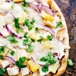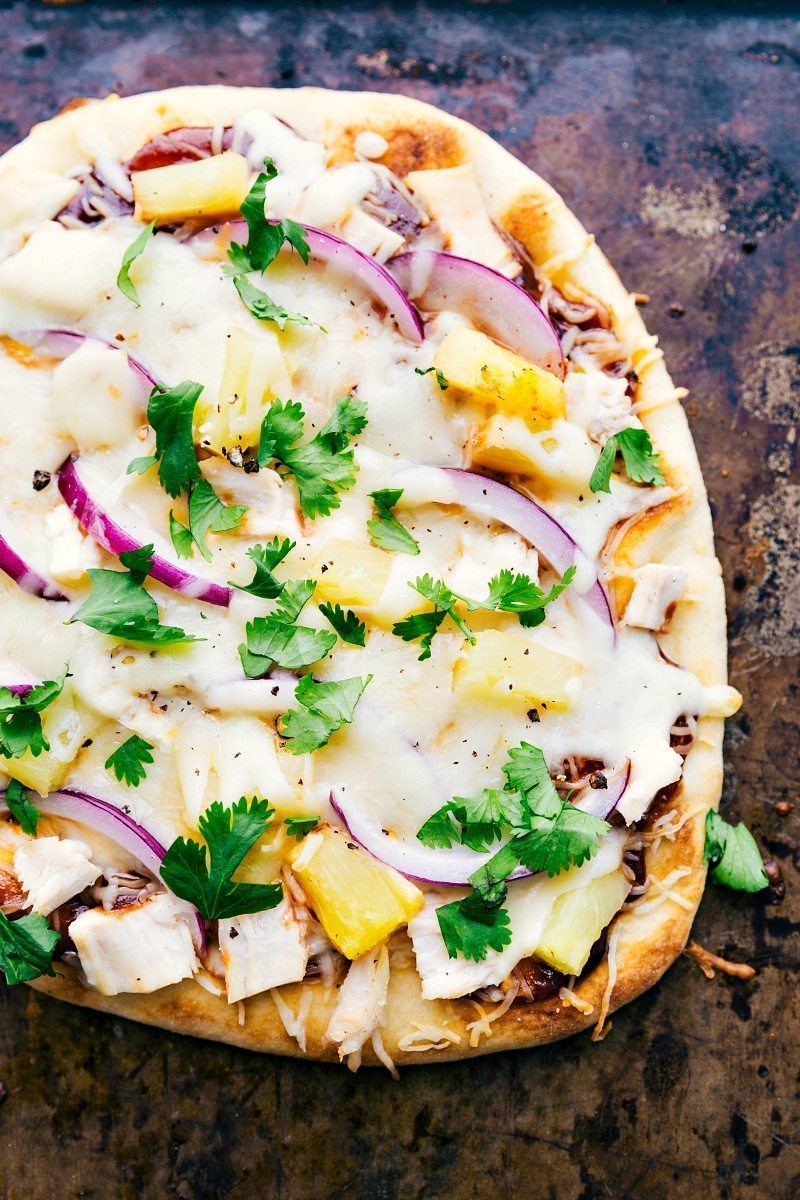 - Spread the BBQ sauce evenly over both flatbreads. Sprinkle both evenly with cheese and then with onions. Top with pineapple tidbits and the shredded chicken. Bake 8-10 minutes or until cheese is completely melted (Do not overbake or the flatbreads will get hard). Remove and top with fresh coarsely chopped cilantro. Add salt and pepper if desired.