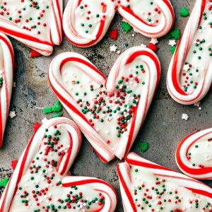 - Set the candy canes on the tray—two together to form hearts all over the tray.