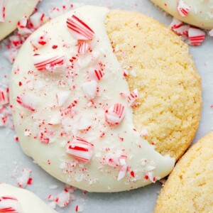 - Dip half of each completely cooled cookie in white chocolate mixture. Slide the bottom of the cookie against the edge of the bowl to get rid of excess chocolate and immediately transfer to a large sheet pan lined with parchment paper. (If the white chocolate is getting hard to work with, just put it back in the microwave for 15โ20 seconds.)
