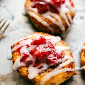 Breakfast and brunch just got easier! Thisย 30-minute (including bake time!), five-ingredient cinnamon roll Cherry Danish checks all the boxes! Fruit, pastry, and icing: who could ask for more?!