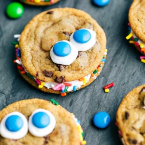 Prepare these cookiesย using the base recipe (with or without caramel and substituting extra chocolate chips for M&Ms), refrigerated dough (see recipe below), or store-bought chocolate chip cookies.
