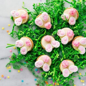 For a couple of yearsย now, bunny bum cookies, cupcakes, or other similar treats ย have been super popular all over the internet, and I thought it was time to add my little twist to them โ making them SUPER simple. These require literally no more than 10 minutes to make!