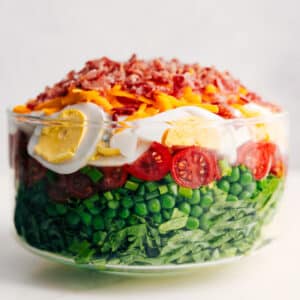 7 Layer Salad is a fresh, crunchy, flavor-packed classic stacked with crisp lettuce, sweet peas, juicy tomatoes, eggs, cheese, bacon, and the creamiest dressing.