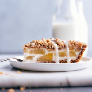 This simple Apple Streusel Pie Recipe starts with a pecan crust, creamy apple filling, crunchy streusel topping, and a drizzle over top. The perfect holiday pie!