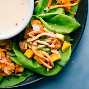 These lettuce wraps have been a huge summer favorite at my house. Theyโre super quick to make, light, refreshing, full of texture & flavor, and thereโs no need to turn on the oven to make them. Which is definitely a must-have in 100-degree weather! We whip out the air fryer to get ultra-crispy chicken in about 11-12 minutes, and by the time theyโre done, just about everything else is ready to go!