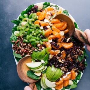 - In a very large bowl, toss the completely cooled pasta with the spinach. Add in celery, apple, oranges, dried cranberries, and coarsely chopped pecans. Drizzle dressing over the salad and toss to combine. Add feta cheese to personal preference and enjoy immediately.