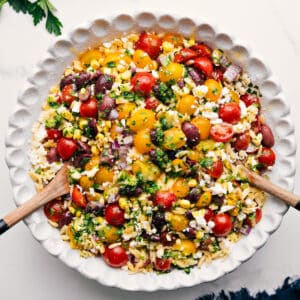 Greek Orzo Pasta Salad is a fresh mix of tender orzo, juicy tomatoes, olives, sweet corn, herbs, and feta tossed in a simple lemon dressing. My sister’s absolute favorite salad!