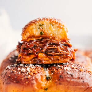 - Remove the pan from the oven and place the top half of the buns over the cheese. Pour and brush the melted butter generously over the tops and sides. Itโs okay if some butter pools at the bottom; this makes the base extra crisp and flavorful. Sprinkle with Parmesan, if using.