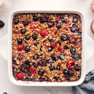The fresher and riper the berries, the better and sweeter the oatmeal will taste. If you’ve got extra fresh berries, add on top of the baked oatmeal for a contrasting texture and additional sweetness.