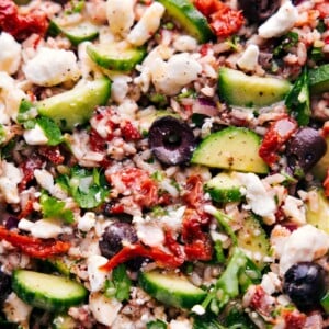 - Salad: To prepare salad ingredients, finely dice cucumber, red pepper, sun-dried tomatoes, red onion, and parsley. Add diced vegetables to the cooled rice; if desired, add some thinly sliced kalamata olives as well. Pour dressing over salad (adding as much as youโd like), and gently toss everything together. Taste salad and adjust seasonings as needed, keeping in mind that the feta cheese will add some saltiness. Top individual servings with cheese, adding as much as youโd like.
