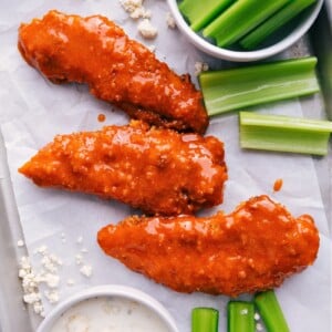 I love serving these Buffalo tenders with celery, carrots, and a good dipping sauce—chunky blue cheese or ranch are my favorites!