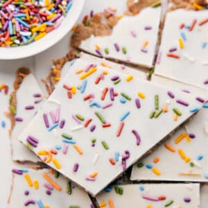 Cake Batter Bark is a fun, sprinkle-loaded snack with a soft cookie dough layer and a smooth white chocolate topping.