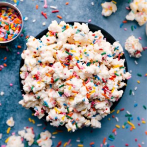 Thisย Cake Batter Popcorn is sweet, crunchy, and loaded with sprinkles! We toss the popcorn in melted chocolate and an actual cake mix for a true cake batter flavor experience!