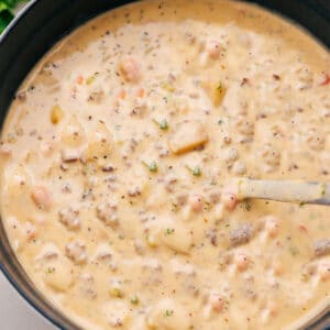 Cheeseburger Soup is cheesy, creamy, and comforting, packed with beef, baby gold potatoes, and veggies.