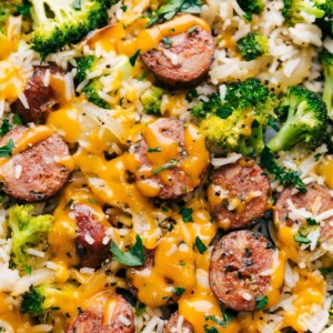 I know broccoli isnโt typically associated with being popular among kids, but have they tried Roasted Broccoli or Chicken Broccoli Rice Casserole? My kids actually request it! So combining that roasted broccoli with rice, lots of melty Cheddar, and chicken sausage? Cheesy Chicken, Broccoli, and Rice is a huge dinner-time win!