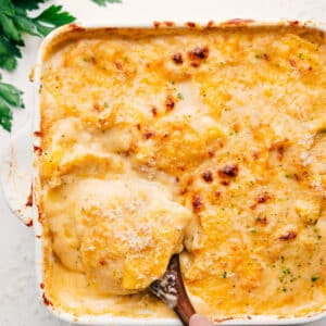 Cheesy Scalloped Potatoes are made with layers of tender, buttery potatoes and rich cheese sauce baked to perfection for the ultimate creamy comfort dish.