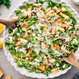 It’s everything you love about a Caesar salad (crisp lettuce, creamy dressing, salty cheese, juicy chicken) tossed with tender pasta and crunchy croutons.