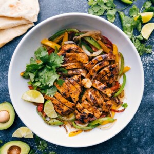 This Chicken Fajita recipe is great for meal prep. I make a double batch and store the chicken, veggies, and toppings in separate containers. Rewarm for quick lunches or easy dinners and serve in tortillas or over a salad. The chicken and veggies keep 3-5 days in the fridge in an airtight container.