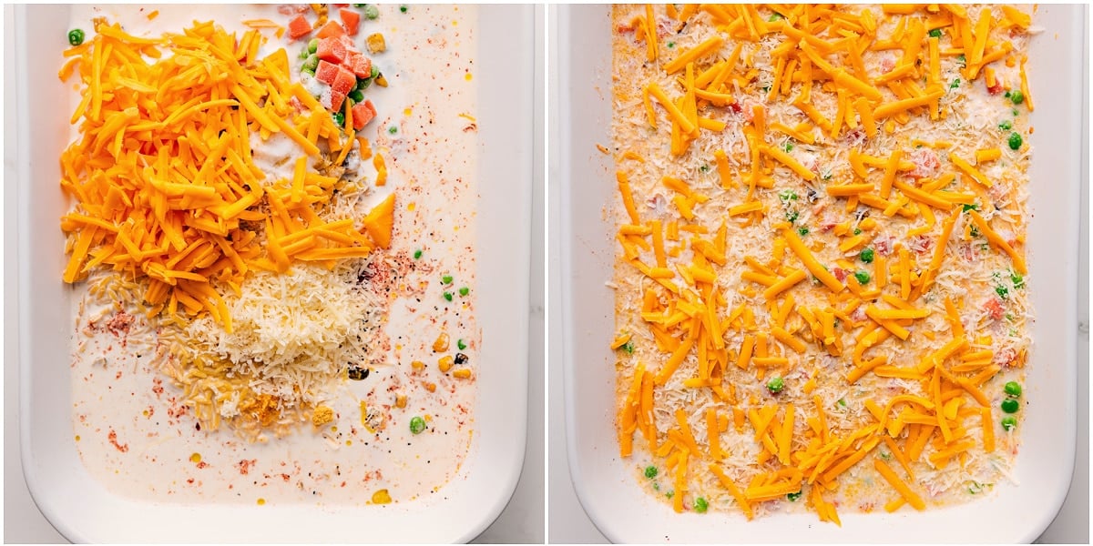 - In the prepared dish, combine olive oil, chicken broth, heavy cream, paprika, garlic powder, ground mustard, peas and carrots, corn, and orzo. Add 1 cup Cheddar, 1/3 cup Parmesan, salt (I add 1 teaspoon), and pepper (I add 1 teaspoon). Stir gently until everything is well combined and press into an even layer.