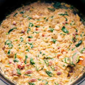 I’m obsessed with the combo of chicken, sun-dried tomatoes, and spinach (some of my faves: Chicken Pasta, Mediterranean Pasta Salad, and Pesto Chicken Tortellini!), so I turned them into this delicious, one-pot Chicken Orzo.