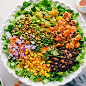 The result? An incredibly delicious, texture-packed salad! Crunchy cabbage, crisp romaine, creamy avocado, tender chicken, and sweet corn all tied together with that amazing dressing!