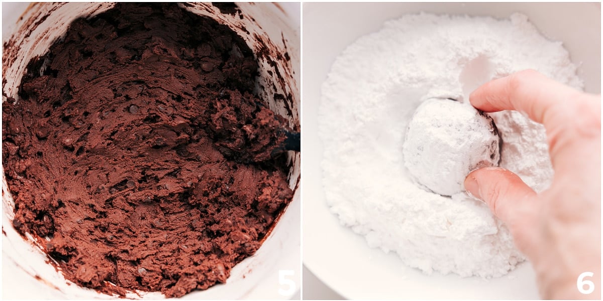 - Scoop and coat: Roll the dough into balls and coat each one in powdered sugar.