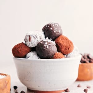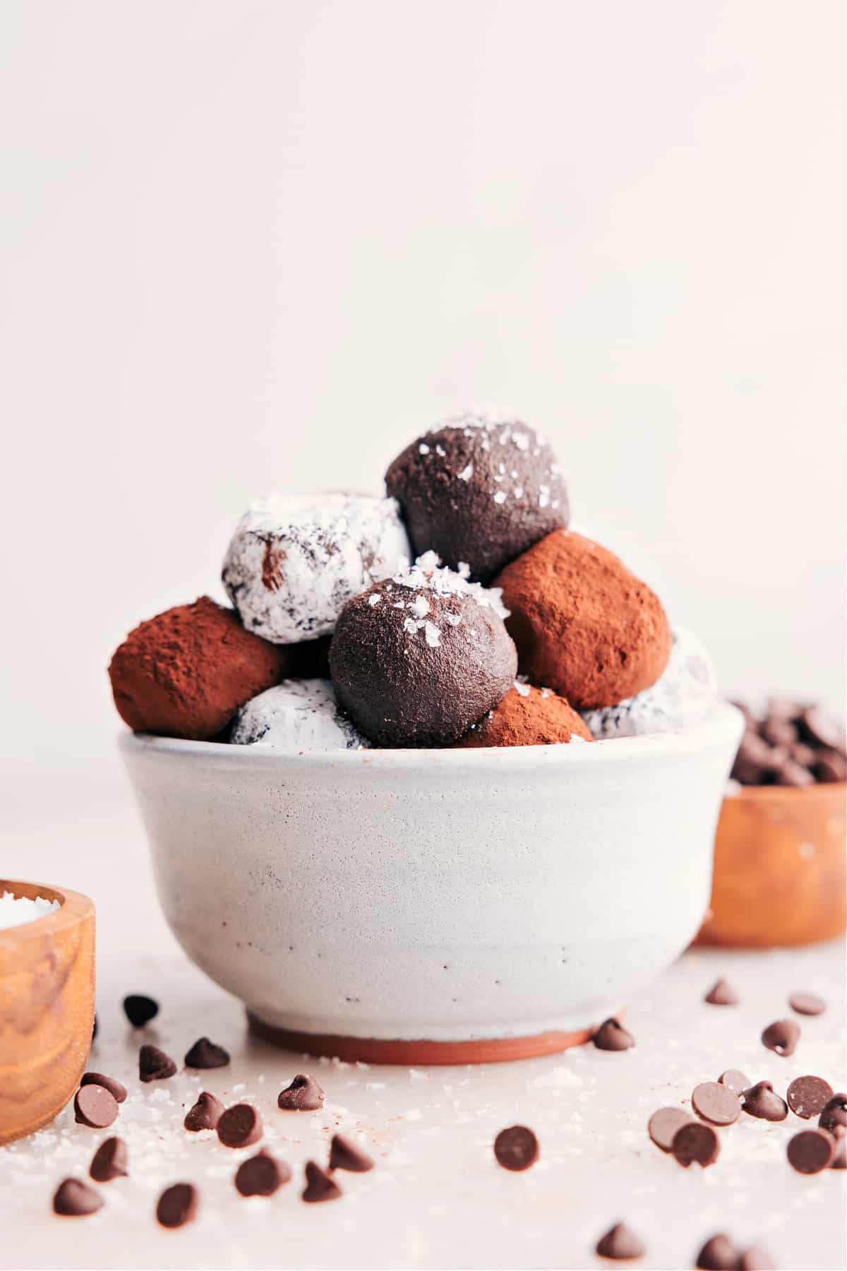 - While the balls are firming for 10 minutes, set out your preferred coatings in small shallow bowls. I like rolling some in finely shredded coconut, cocoa powder, and powdered sugar. Roll balls into toppings and serve truffles at room temperature.