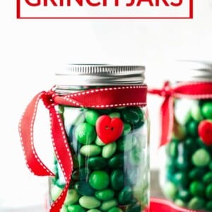 Grinch Jars make a fun holiday gift! To make your jar festive, fill mason jars, tie on a red ribbon, and add a heart button as a nod to the Grinchโs growing heart.