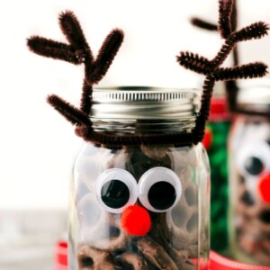 Reindeer Jars are a fun gift or festive decoration! Fill a mason jar with chocolate-covered pretzels, then add pipe cleaner antlers, googly eyes, and a red pom-pom nose. Itโs a great way to use a Christmas mason jar in a creative manner.