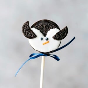 - Dip one end of the lollipop stick into the melted chocolate and press that side into the cream side of the oreo.