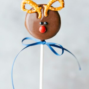 - Press the broken pretzels at the top of the pop to form antlers. Hold until they will stay. (Milk chocolate hardens much slower than candy melts and white chocolate so you might need to wait a couple of minutes before decorating so the pretzels will stay put.)