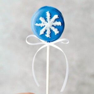 - Once hard, pipe the shape of a snowflake on the pop using the white decorating gel.