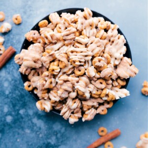 - Melt white chocolate chips and vegetable oil in a microwave-safe bowl in bursts of 30 seconds, stirring between each burst for 15 seconds until chocolate is melted and smooth. Transfer melted white chocolate to a plastic bag and seal the bag without air. Cut off the tip of the bag and pipe the melted white chocolate over the cereal (it may seem like too much, but we want the cereal well coated!). As soon as the cereal is covered in white chocolate, sprinkle the cinnamon-sugar mixture evenly over everything.