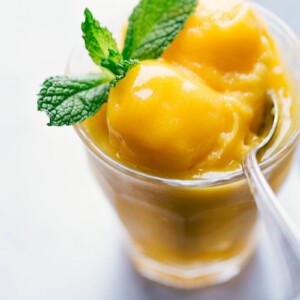 Creamy, fresh, tangy, and sweet, this Mango Sorbet Recipe is made with honey mangoes and a splash of fresh lemon.