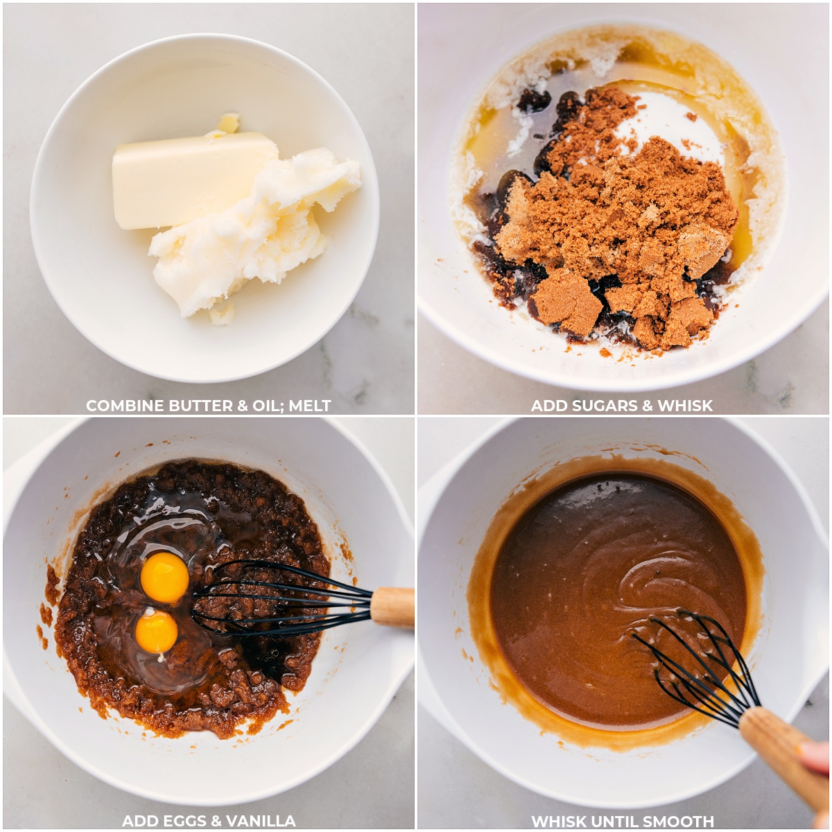 - Use a spatula to scrape every bit of oil and butter to a large bowl. Add in brown and granulated sugar. Use a whisk to thoroughly mix. Add vanilla extract and eggs, whisking vigorously until the mixture is smooth and fully emulsified with no oil separation.