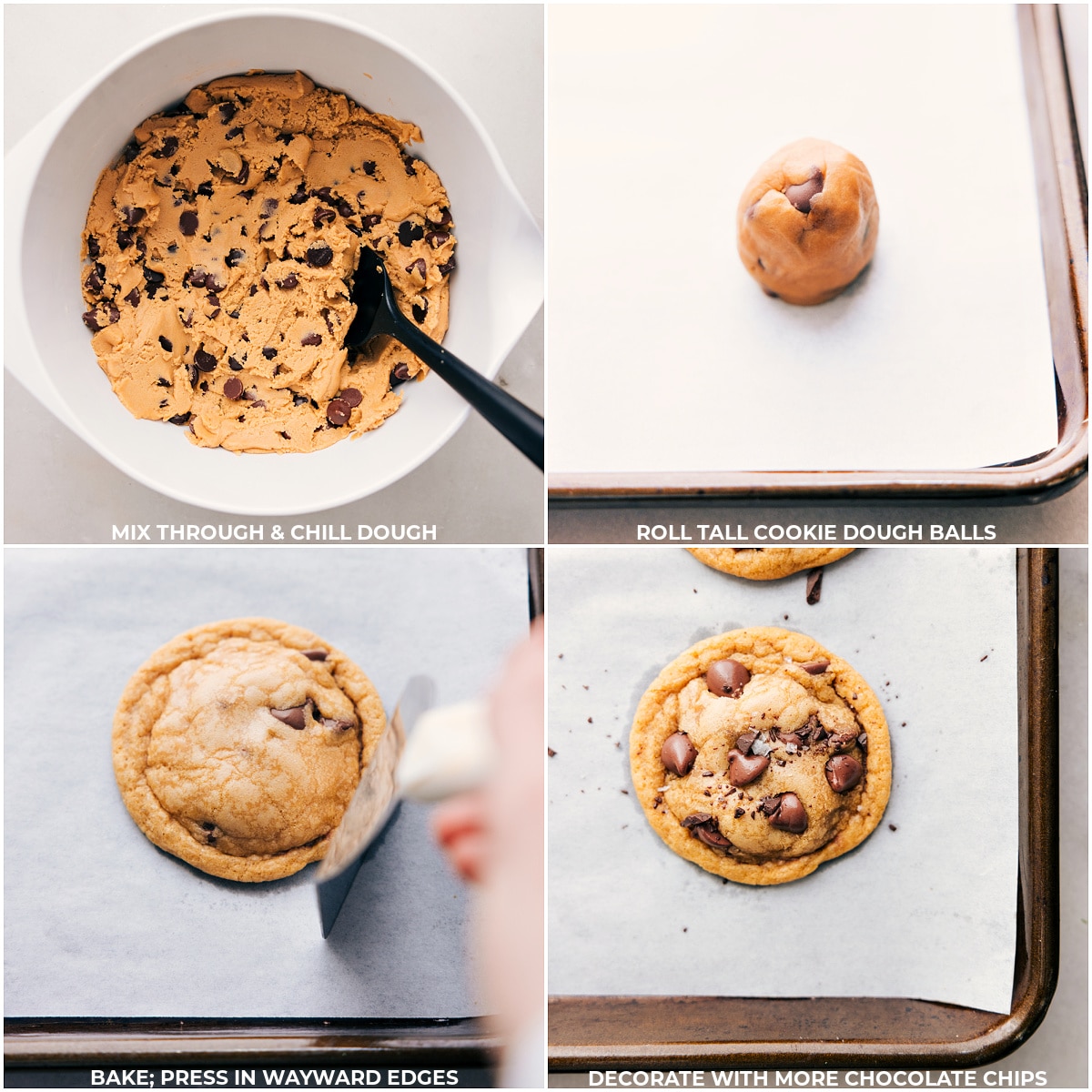 - Remove from the oven and (if needed), tidy up any ragged edges by pressing them inward with a metal spatula. If desired, press in a few chocolate chips in the tops of the cookies. Let the cookies rest on the sheet pan for 3โ4 minutes before transferring to a cooling rack.