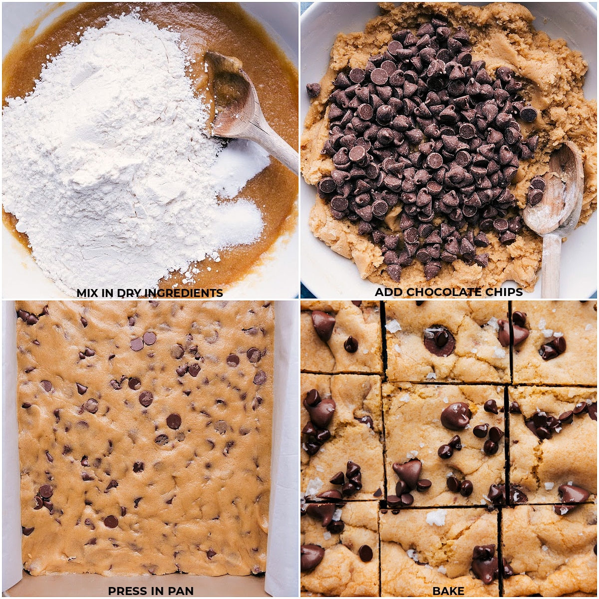 - Use a wooden spoon to stir in baking soda, salt, and flour until just combined. Fold in chocolate chips. If needed, switch to a hand mixer, but donโt overmix. Press dough evenly into pan. If desired, press a few more chocolate chips into the top.