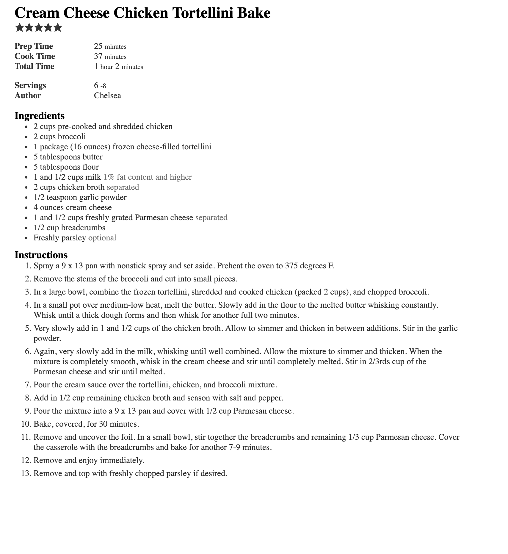 - Preheat oven to 375°F. In a 9×13-inch baking dish, combine chopped broccoli, chicken, and frozen tortellini (no need to thaw). Toss everything together.
