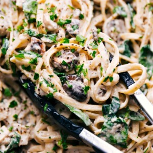 This Creamy Chicken Pasta Recipe brings big flavor with hardly any work. Itโs made with rotisserie chicken, spinach, and mushrooms over pasta with a one-ingredient cream sauce.