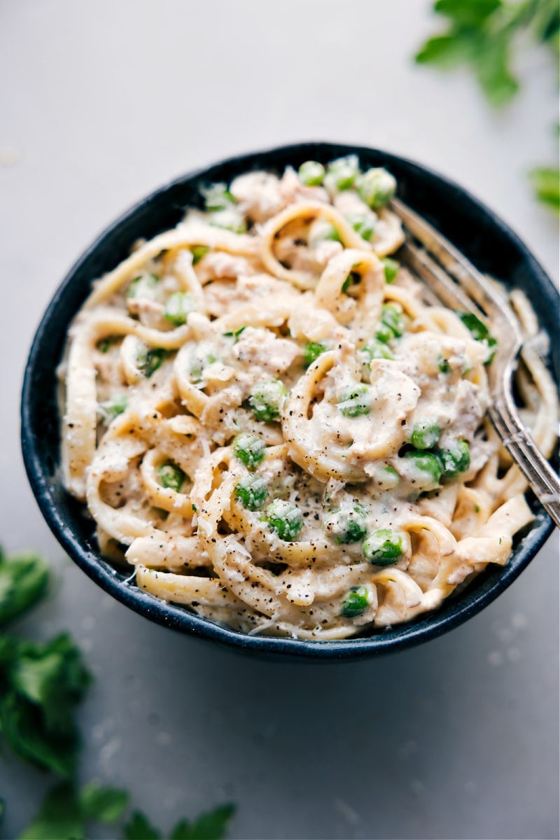 - Add the drained pasta and peas. Toss, using tongs, for 1โ2 minutes or until the sauce thickens and coats the pasta nicely. If the sauce gets too thick, add a splash of the reserved pasta cooking water. Once sauce clings nicely to pasta, add the tuna and some finely chopped parsley if desired (I add 2 tbsp). Gently stir to combine, trying to keep the flakes of tuna intact if possible. Taste and adjust the seasoning, adding salt if needed.