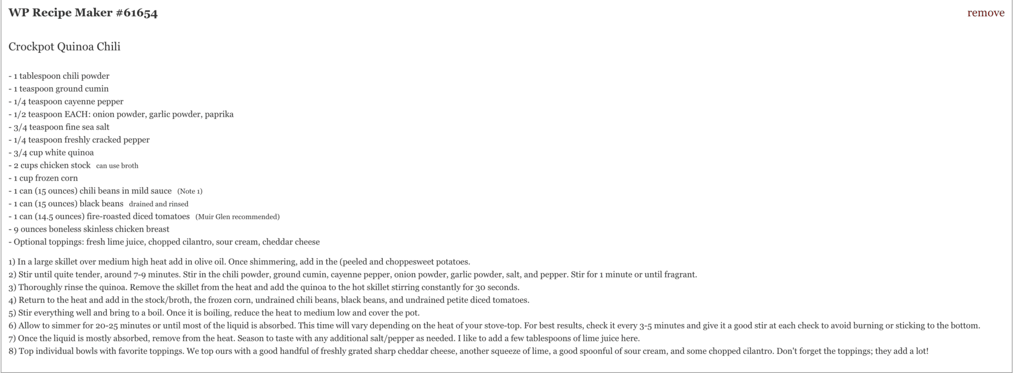 - To make Crockpot Quinoa Chili vegetarian or vegan, I recommend following this recipe instead (we โreplaceโ the chicken with sweet potatoes).