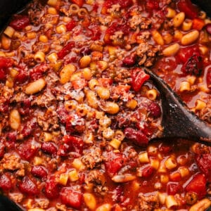 This version isn’t fully traditional, but it’s hearty and full of flavor. It’s made with pasta, beans, ground beef, Italian spices, and a rich tomato base, and topped with Parmesan for a warm, comforting meal.