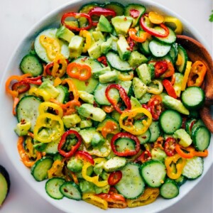 - Wash, thoroughly dry, and prep the veggies. Add thinly sliced cucumbers, thinly-sliced peppers, and diced avocados to a large bowl. Shake the dressing again and drizzle it on. Gently toss to combine. Taste and adjust seasonings to personal preference. Enjoy promptly.