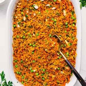 While my baked white and brown rice are staples, I love using the same method (uncooked rice baked in a casserole dish with liquid) to make flavored versions too. Iโve shared herb rice, lemon rice, pesto rice, Mexican rice, yellow rice, and coconut riceโฆso it was definitely time for a curry rice! This one is outrageously flavorful and just as easy as the others. I hope you love it!