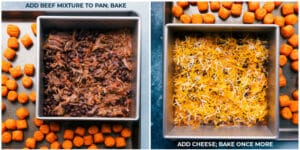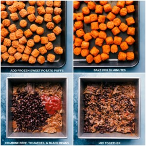- BEEF: Meanwhile, open the beef and add all the beef (and liquids) in an 8×8-inch pan. Add drained and rinsed black beans and 1/3 cup of the drained tomatoes on top. Mix, break apart beef (with a wooden spoon) and spread in an even layer. Once the potatoes have baked for 10 minutes, flip them with a spatula and then make room to nestle the beef-filled pan on the sheet pan. Bake for 10 more minutes. Remove, toss potato puffs around again and then sprinkle cheese evenly on the beef mixture. Return to the oven and bake for 5-7 more minutes or until cheese is melted, beef is fully warmed through, and tots are tender.