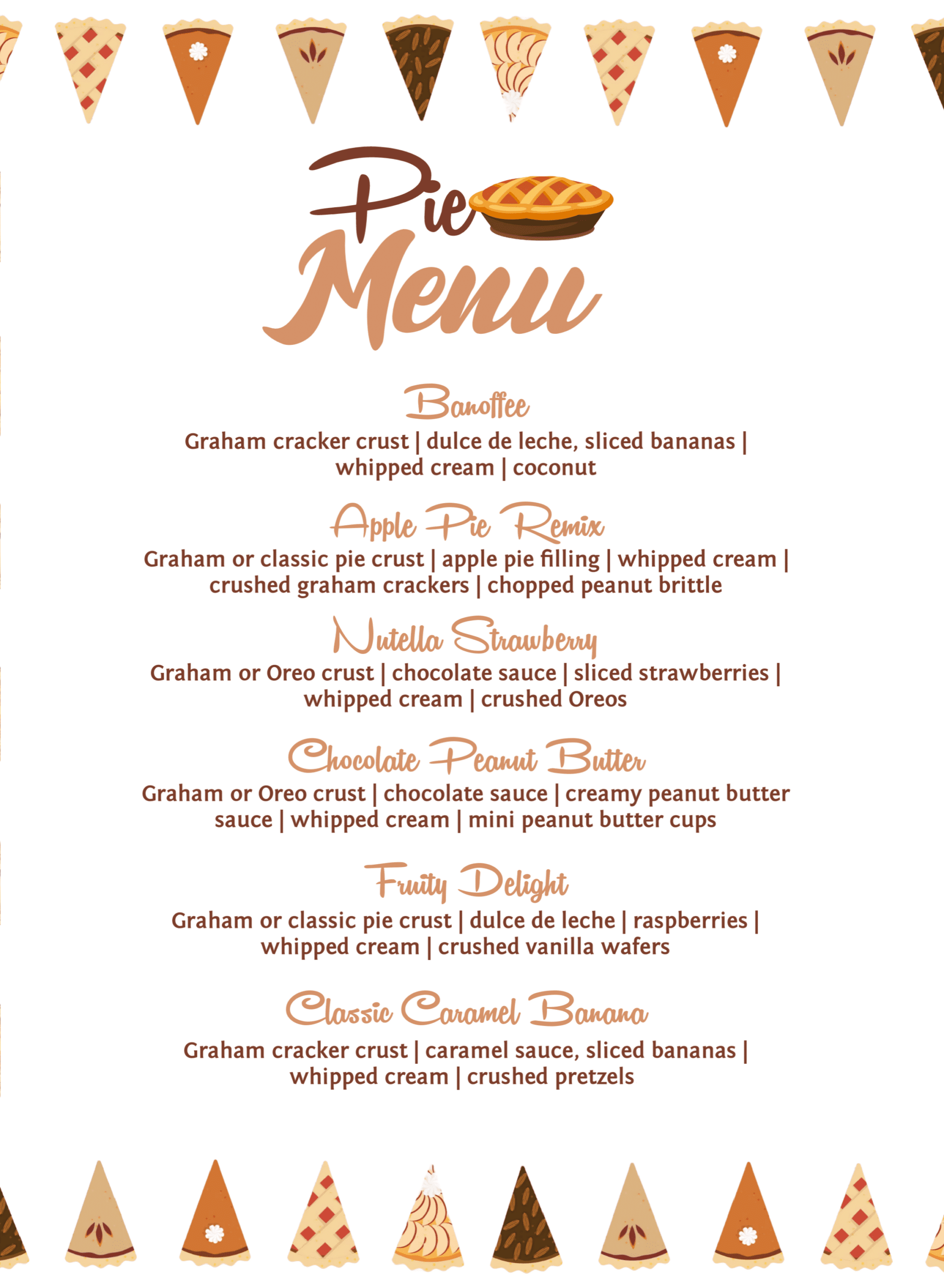 - Nutty pecan delight: Graham or classic pie crust, pecan sauce, whipped cream, crushed graham crackers, chopped mixed nuts, toffee bits