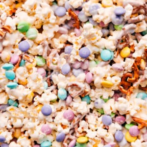 Easter Popcorn is a sweet and salty mix of popcorn, pretzels, pastel M&Mโs, and creamy white chocolate thatโs bright, festive, and seriously hard to stop snacking on!