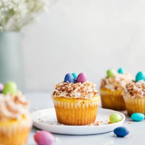 Delicious carrot cake cupcakes! I made them from scratch using your recipe and they were so moist and flavorful. The decorative touches with the toasted coconut and chocolate eggs were so adorable and perfect for Easter.