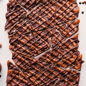- Melt the remaining 1/3 cup milk chocolate chips in the microwave. Transfer to a small resealable bag, snip off the tip, and pipe stripes over the caramel. Add flaky salt if desired.