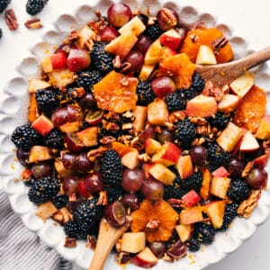 Fall Fruit Salad is a delicious mix of crisp apples, juicy grapes, sweet clementines, blackberries, and toasted pecans tossed in a maple-cinnamon citrus dressing.